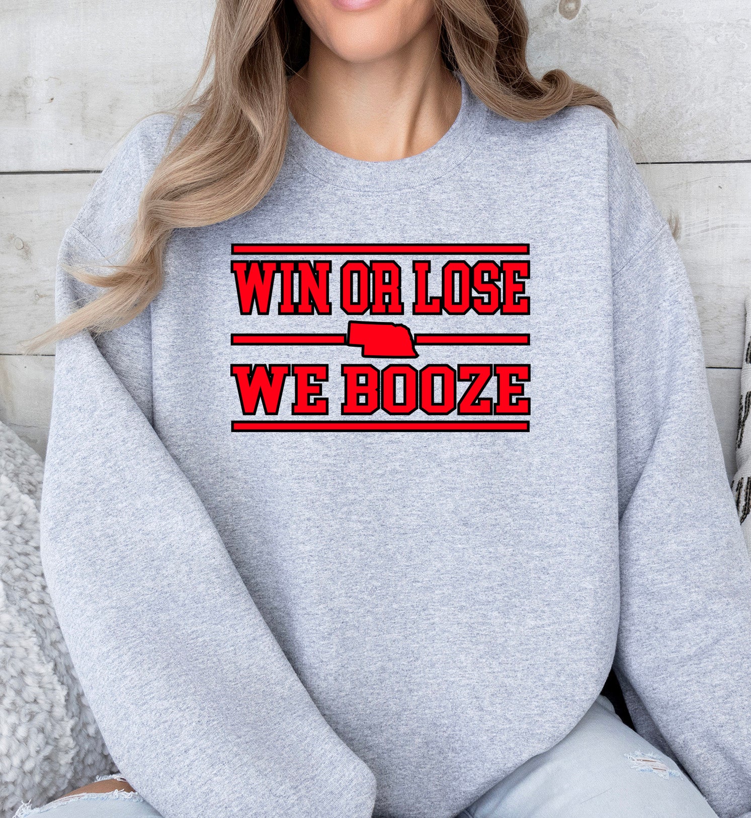 Get ready to show your Nebraska pride — with a twist! Our “Win or Lose We Booze” crewneck sweatshirt is the ultimate game-day essential for every die-hard Husker fan. Whether it’s football, basketball, or a heated cornhole match at the tailgate, this soft, midweight cotton sweatshirt keeps you comfy while you celebrate (or commiserate) in true Nebraska style.